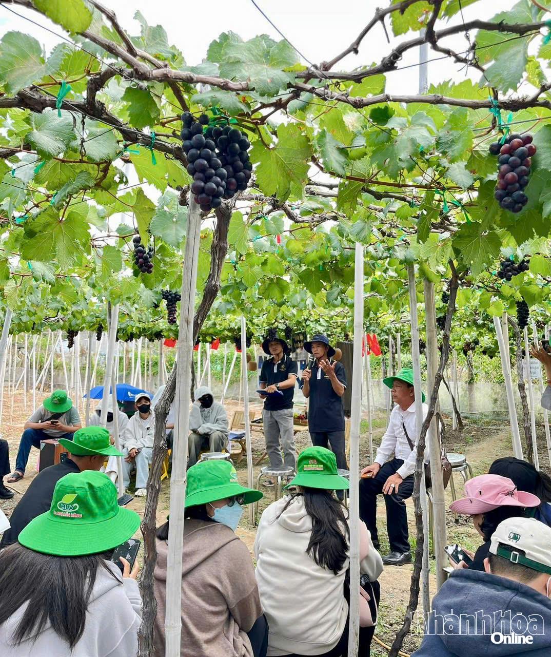 Du khách nghe giới thiệu kỹ thuật trồng, chăm sóc nho tại vườn.