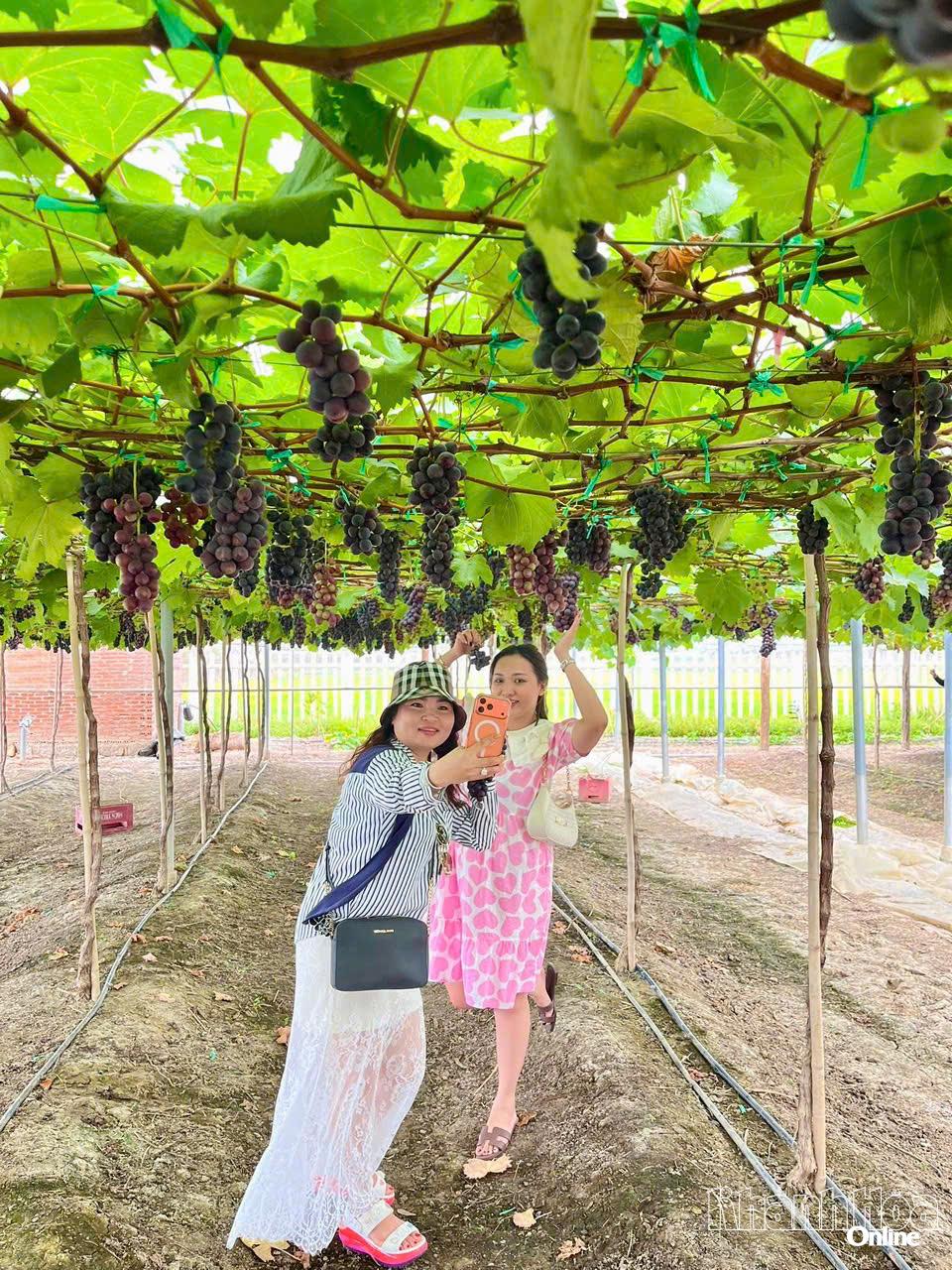 Du khách thích thú chụp ảnh dưới giàn nho chín rộ tại vườn nho Hoàng Yến 3 (xã Ninh Phước).