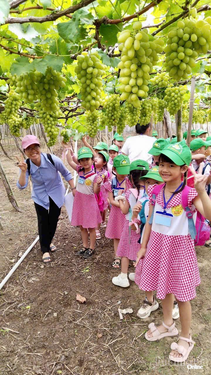 Học sinh trải nghiệm tham quan, tìm hiểu vườn nho và thưởng thức nho tươi tại vườn nho Trí Hà ( phường Đô Vinh).