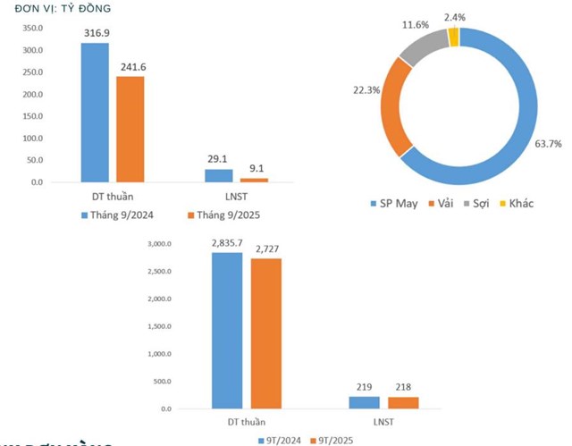 Theo TCM, kết quả đi xuống trong tháng 9 do cuối quý III vẫn là thời điểm "mùa trũng" của ngành dệt may thời trang, cùng với ảnh hưởng từ việc khách hàng xuất hàng sớm trong các tháng trước để tránh thuế đối ứng mới tại thị trường Mỹ. Lợi nhuận chưa đạt kỳ vọng do đơn hàng giảm khiến nhà máy vận hành chưa hết công suất, dẫn tới chi phí sản xuất tăng và biên lợi nhuận giảm so với cùng kỳ.