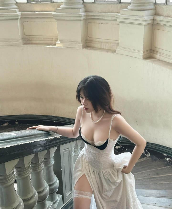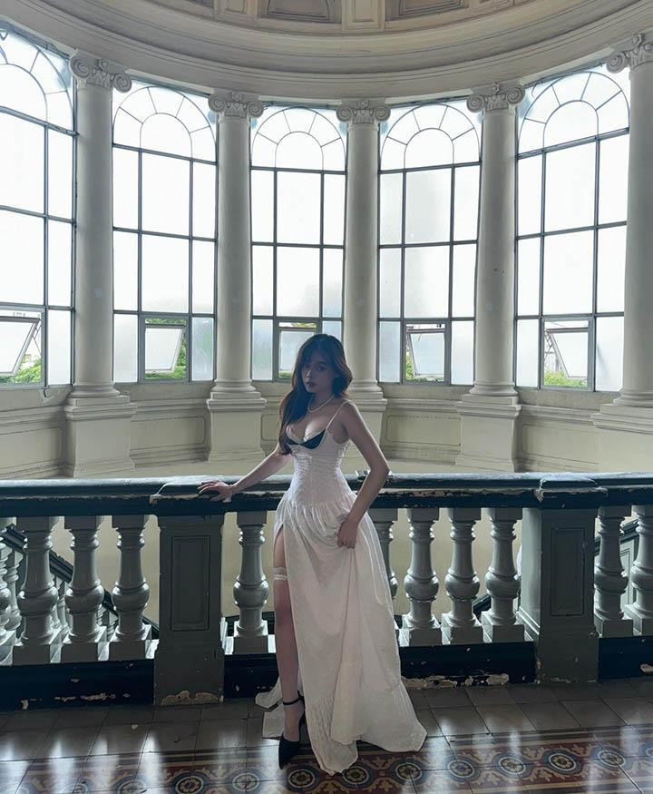 Trong loạt ảnh "lọ lem" gây chú ý, Quỳnh Anh chọn chiếc váy dài trắng tinh khôi, thiết kế hai dây mảnh mai với các chi tiết ren và đường xẻ tà cao, tạo nên hình ảnh một nàng công chúa bước ra từ câu chuyện cổ tích nhưng mang tinh thần tự do, hiện đại.