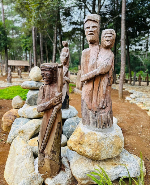 Những thân tượng đã phủ màu rêu phong nằm lấp ló dưới tán rừng có những thân tượng đã hơn chục năm, có những thân tượng mới được đẽo đục nhưng tất cả đều khiến nhiều người trầm trồ choáng ngợp. Những thân tượng đặt rải rác dưới tán rừng nguyên sinh, trên những lối đi lát đá, tạo nên không gian hoang sơ nhưng đầy sức sống như chìm trong văn hóa tộc người trăm năm của những Mơ Nâm, Ba Na, Gia Rai, Xơ Đăng trên miền sương mờ ảo này.