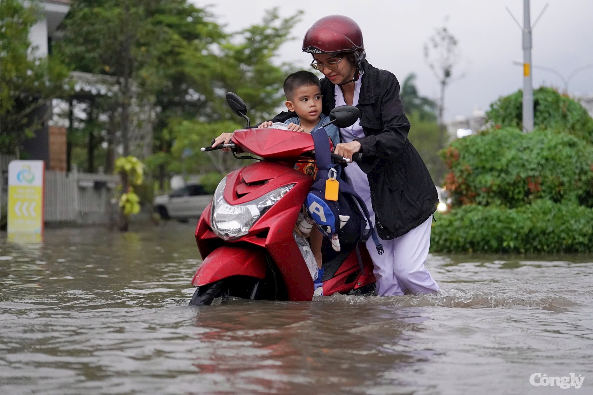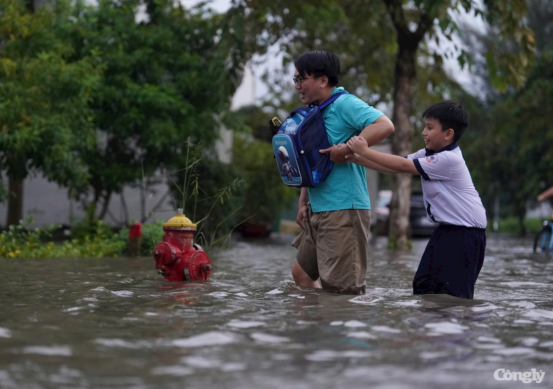 Khu vực này có trường tiểu học, triều cường dâng vào giờ tan tầm nhiều khiến tuyến đường ngập nặng, xe cộ chết máy hàng loạt, phụ huynh phải bì bõm lội nước để đón con.