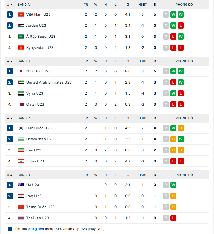 U23 Việt Nam giành vé với vị trí nhất bảng A. Tấm vé còn lại sẽ là cuộc cạnh tranh giữa U23 Jordan và U23 Saudi Arabia.