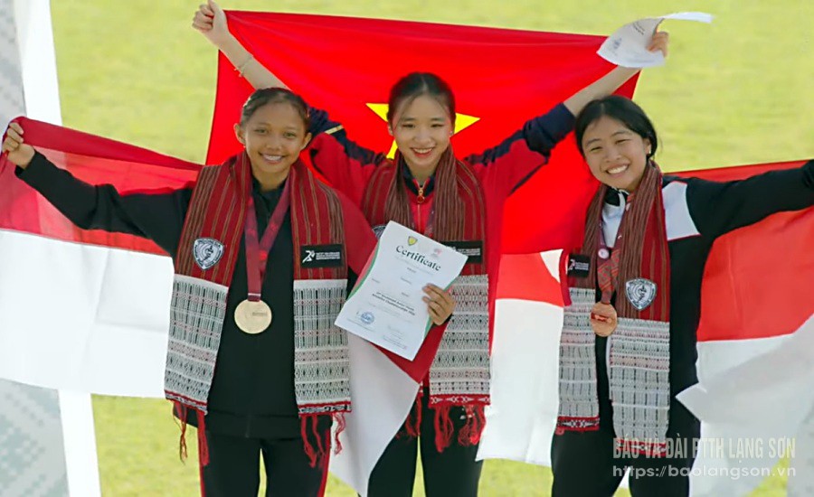 Lương Thị Khan (ở giữa) nhận Huy chương Vàng nội dung chạy cự li 3.000 m nữ