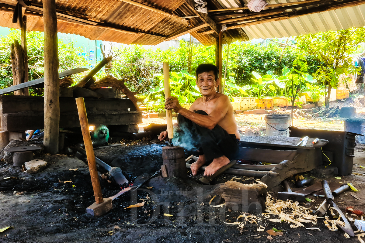 Chú Búa, cái tên như vận vào nghiệp búa đe, sinh năm 1946, nay đã bước sang tuổi 79 nhưng ánh mắt vẫn rực sáng mỗi khi đứng bên lò than hồng rực lửa. Đôi bàn tay gân guốc mang dáng hình năm tháng của chú vẫn nhịp nhàng điều khiển những nhát búa chuẩn xác, dứt khoát như thể thời gian chưa từng chạm đến sức lực của người thợ già.