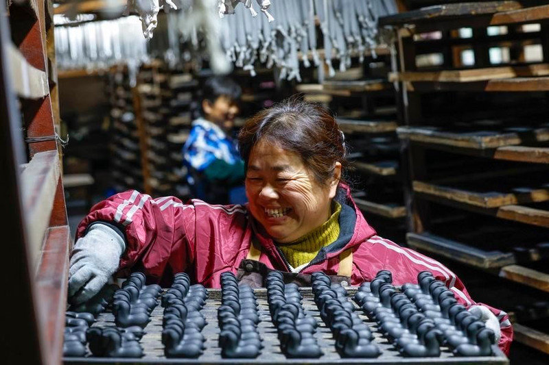 Một nữ nghệ nhân phơi các thỏi mực Huy Châu.