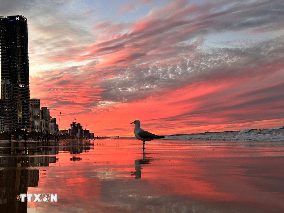 Hoàng hôn đỏ rực tại thị trấn Surfers Paradise trong mùa Đông Australia. (Ảnh: Thanh Tú/TTXVN)