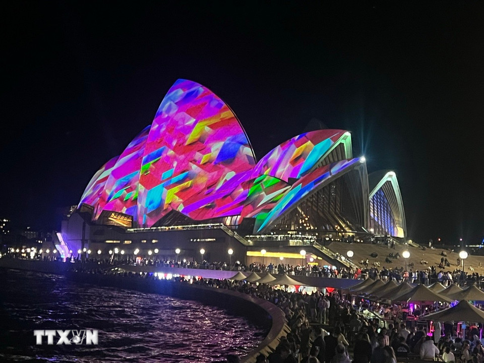 Nhà hát Con Sò ở thành phố Sydney (Australia) rực rỡ sắc màu trong Lễ hội Ánh sáng Vivid Sydney nổi tiếng thế giới. (Ảnh: Thanh Tú/TTXVN)