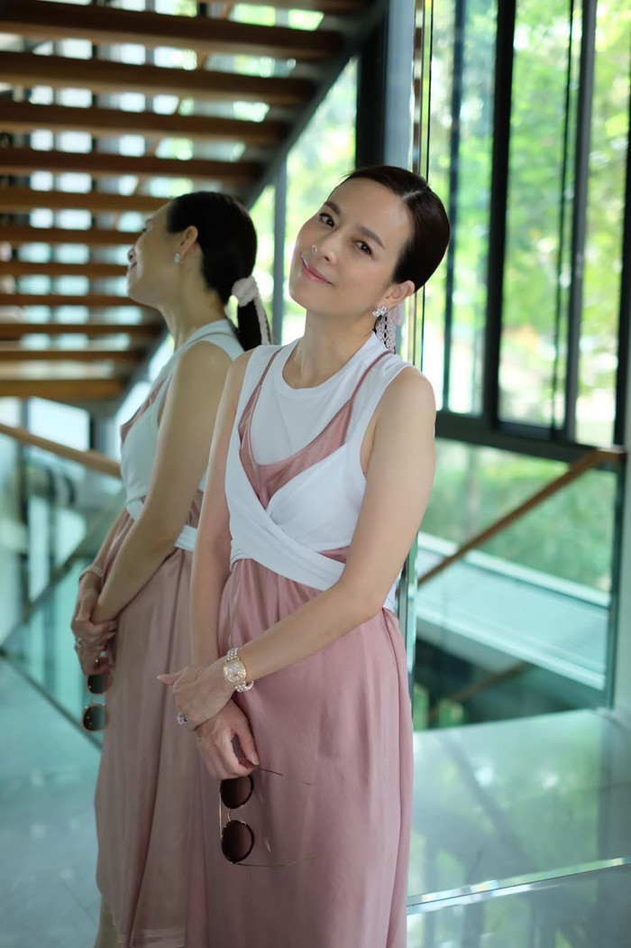 Lối trang điểm của Madam Pang nhất quán theo xu hướng "less is more": làn da căng bóng, lớp nền tự nhiên, eyeliner mỏng và son môi gradient nhẹ nhàng, góp phần hoàn thiện hình ảnh tươi tắn, thanh lịch. Ảnh: FBNV