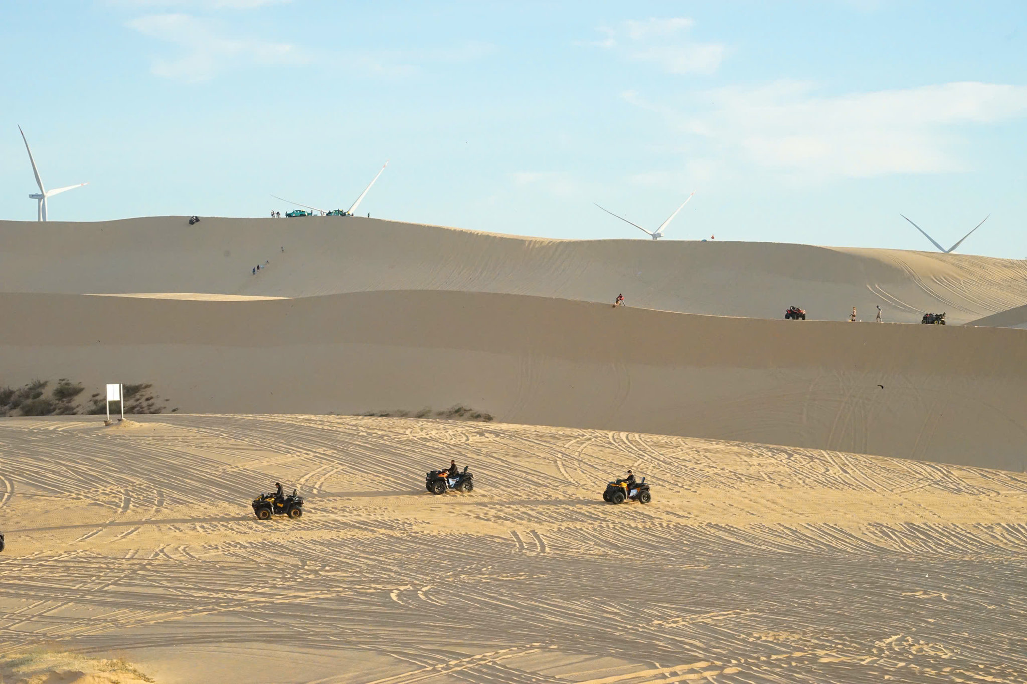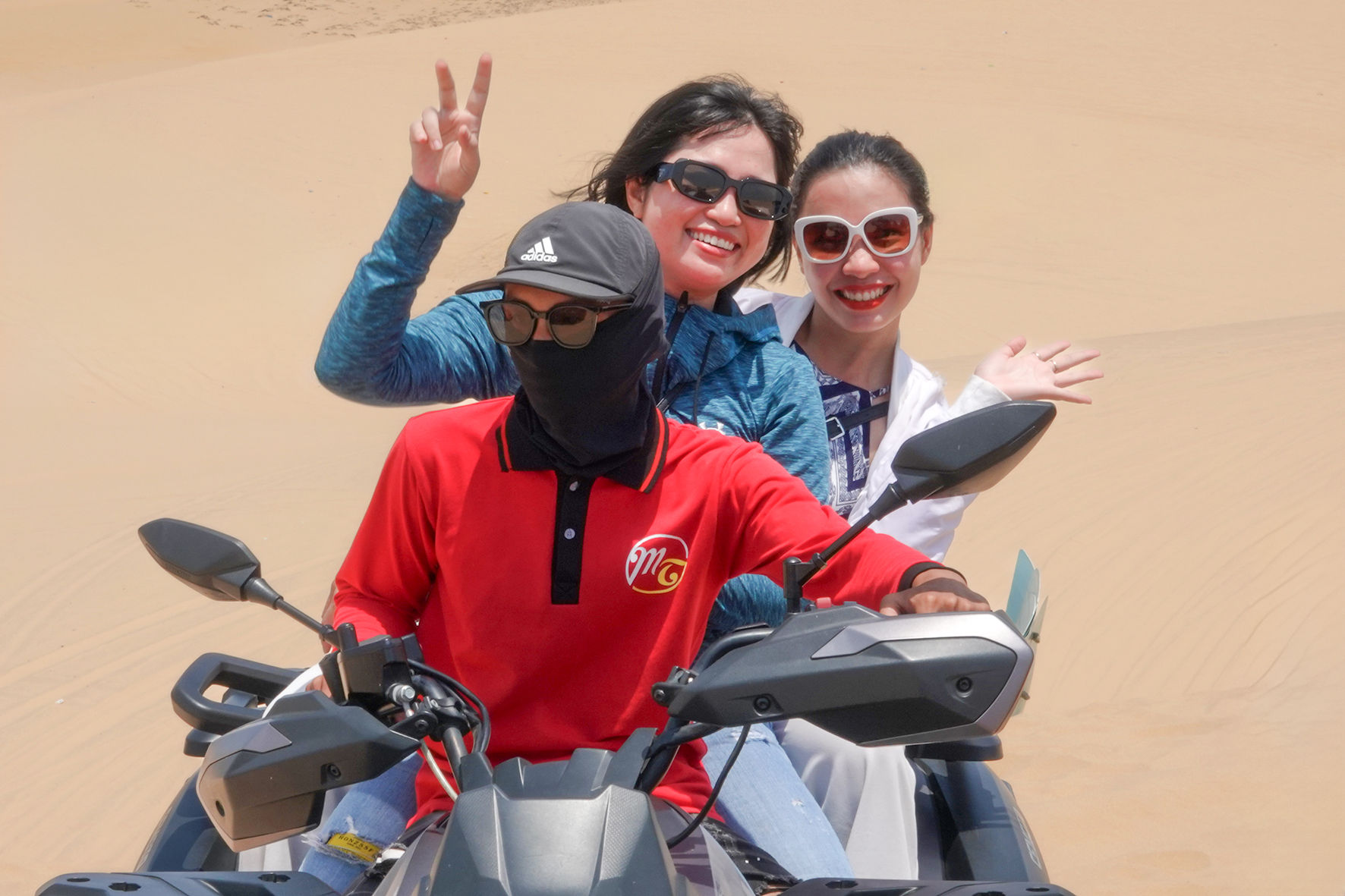 Du khách thích thú khi ngồi trên xe mô tô trải nghiệm trên đồi cát