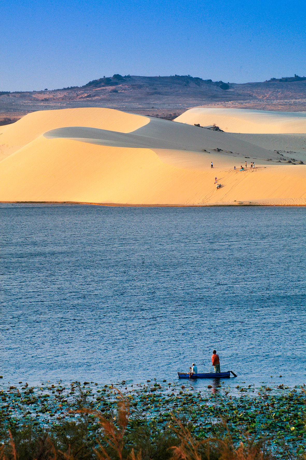 Xung quanh bàu nước, thời điểm mùa hè có rất nhiều sen hồng điểm tô cho mặt hồ trong xanh phẳng lặng thêm phần rực rỡ. Đứng từ trên đồi cát nhìn xuống, mặt nước tựa gương dịu mát, óng ánh sắc sen trông rất thơ mộng, giúp xua bớt cái nắng nóng bỏng.