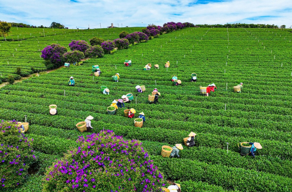Những ngày đầu xuân 2026, sắc tím rực rỡ của hoa mua bung nở giữa bạt ngàn chè xanh đã tạo nên khung cảnh đầy cuốn hút tại nông trường chè Tằng Vĩnh An (xã Bảo Lâm 1, tỉnh Lâm Đồng).