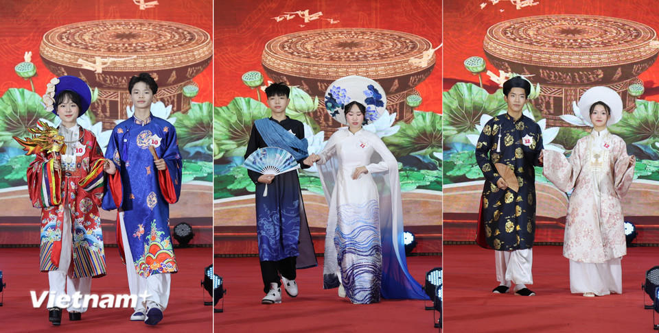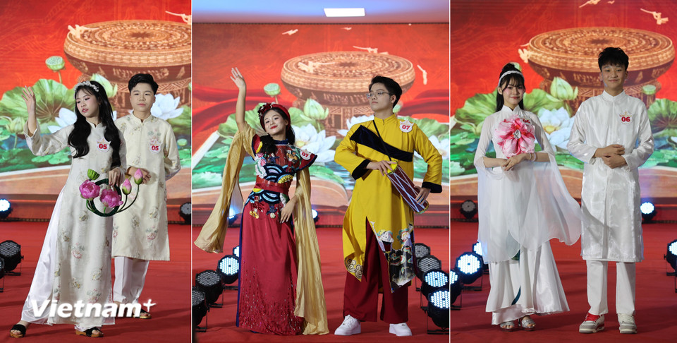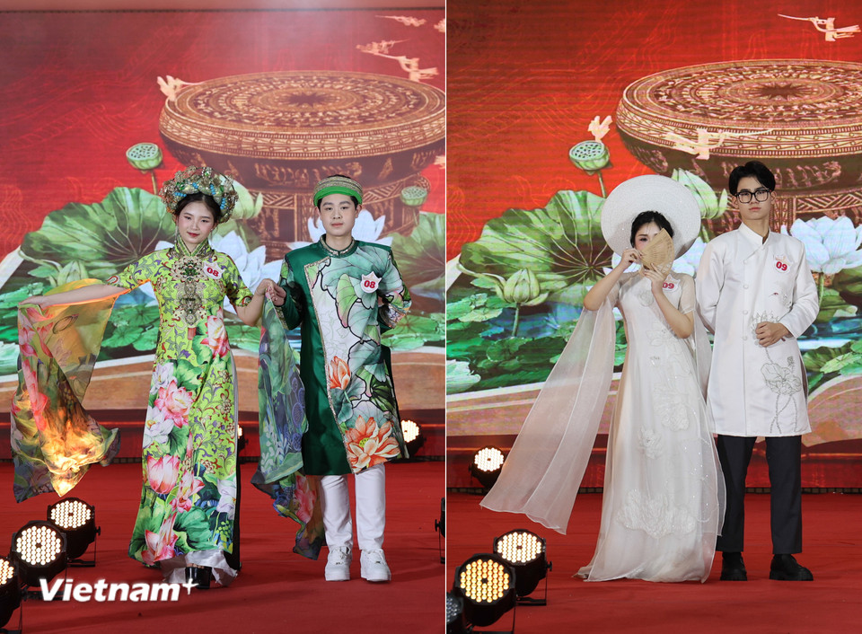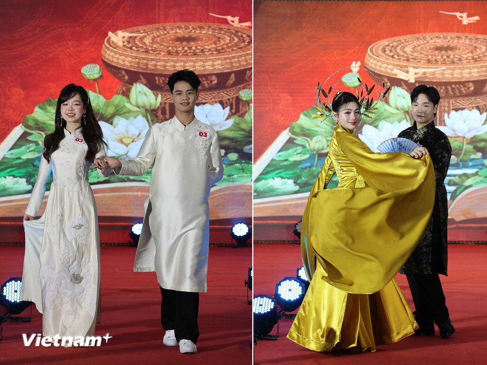 Các đôi thí sinh là học sinh của trường tự tin trình diễn vẻ đẹp trí tuệ và thanh lịch trong cuộc thi. (Ảnh: Hoàng Long/VietnamPlus)