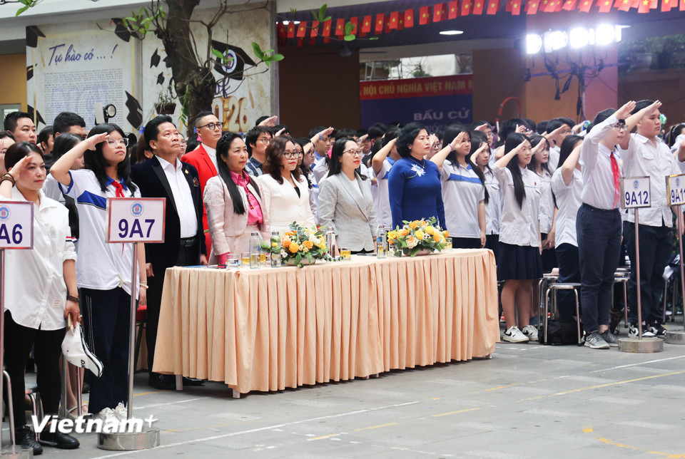 Các đại biểu và học sinh làm lễ chào cờ trong chương trình Ngày hội Tiến bước lên Đoàn, được tổ chức hôm 20/3 tại Trường Trung học Cơ sở Ngô Sĩ Liên. (Ảnh: Hoàng Long/VietnamPlus)