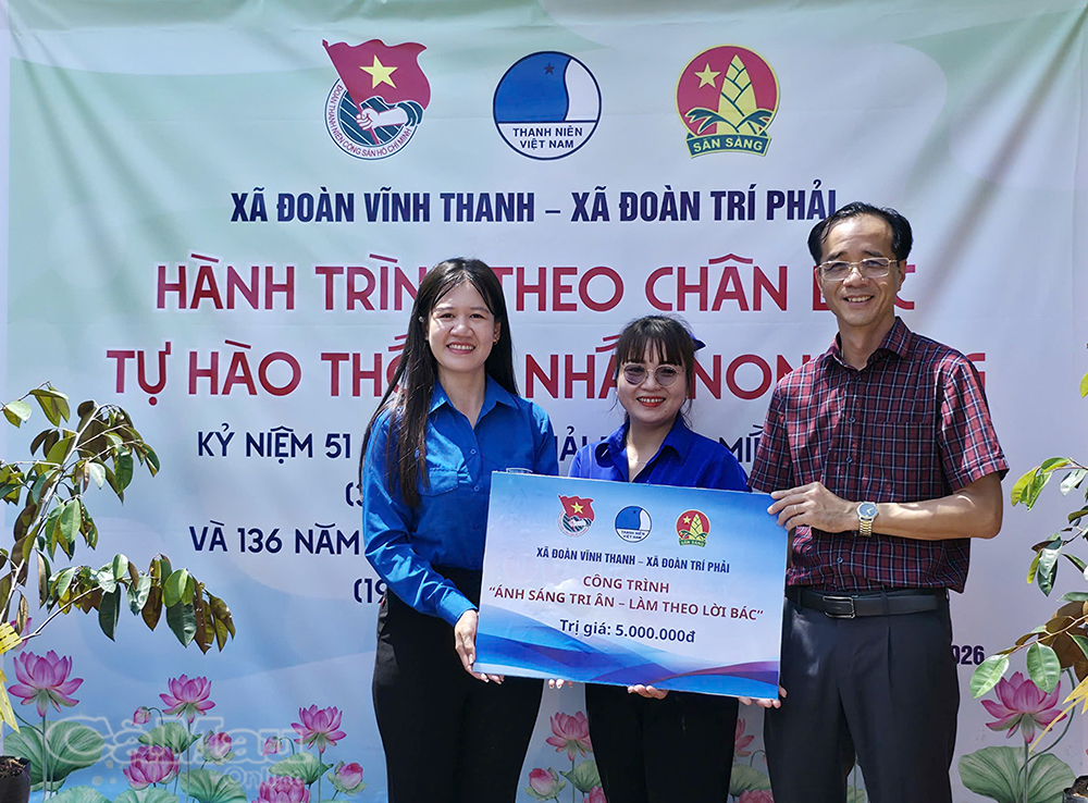 Bí thư Đảng ủy xã Vĩnh Thanh Ngô Nguyên Phong trao hỗ trợ kinh phí thực hiện công trình “Ánh sáng tri ân - Làm theo lời Bác”.
