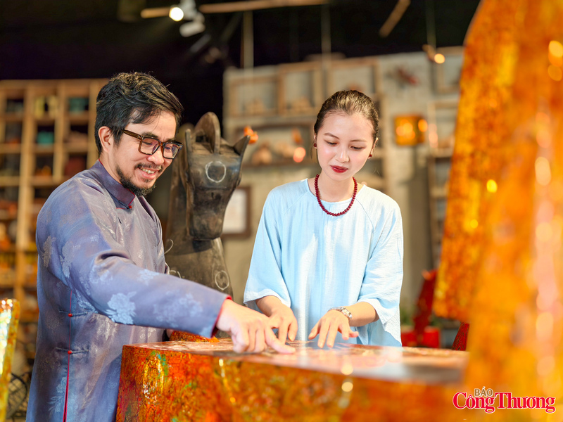 Dưới sự dẫn dắt của nghệ nhân Nguyễn Tấn Phát, du khách được trực tiếp chạm, tự tay vẽ nên những sắc màu đương đại và thể hiện cảm xúc của mình trên tác phẩm.