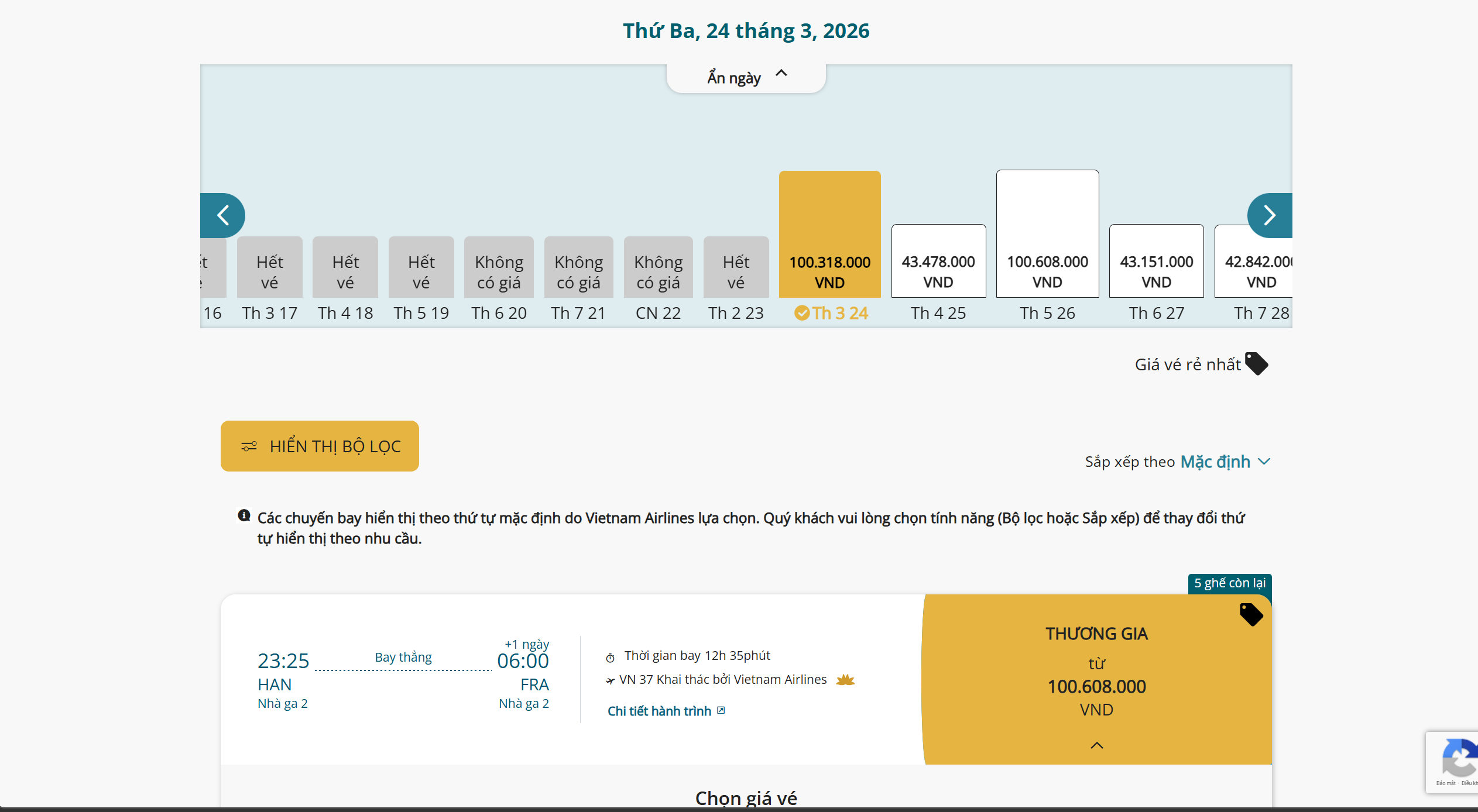 Cụ thể, trên chặng Hà Nội - Frankfurt (Đức), nhiều ngày bay trong tuần đầu tháng 3 hiển thị tình trạng hết vé chiều từ Việt Nam sang châu Âu. Những ngày còn ghế ghi nhận mức giá hơn 100 triệu đồng/chiều, một số ngày khác dao động từ khoảng 42 triệu đồng đến trên 100 triệu đồng.