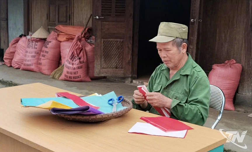 Ông Long tỉ mẩn cắt giấy đỏ trang trí bàn thờ, chuẩn bị đón Tết theo phong tục truyền thống.