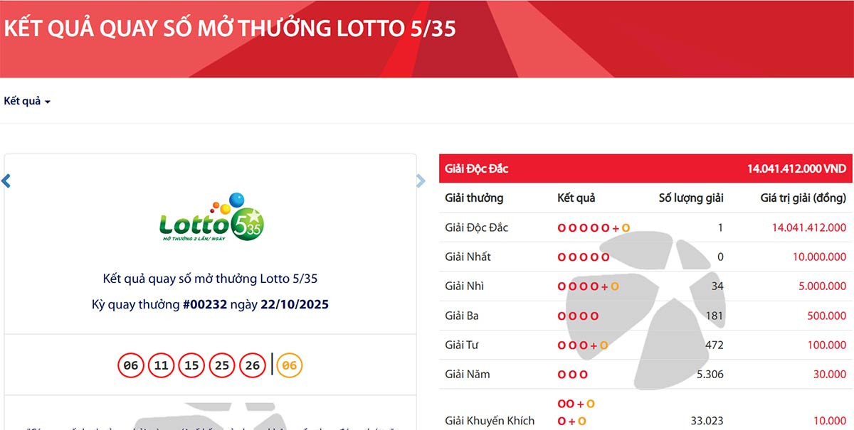 Công ty Xổ số Điện toán Việt Nam (Vietlott) thông báo, tại kỳ quay số mở thưởng lần thứ 232 của loại hình xổ số tự chọn Lotto 5/35 diễn ra vào đêm 22/10, Hội đồng quay thưởng của Vietlott xác định có 1 vé số đã trúng giải độc đắc trị giá 14.041.412.000 đồng (hơn 14 tỷ đồng).