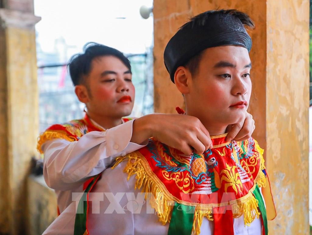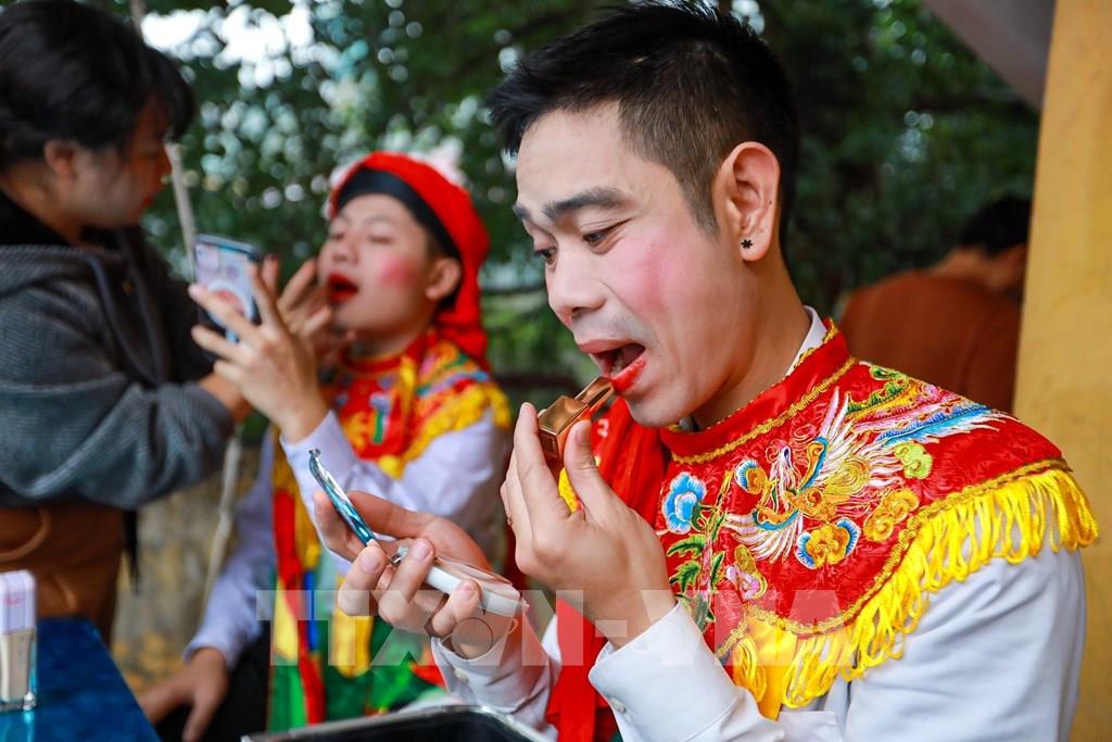 Các thành viên chuẩn bị hóa trang, trang phục trước giờ biểu diễn. Ảnh: Khánh Hòa - TTXVN