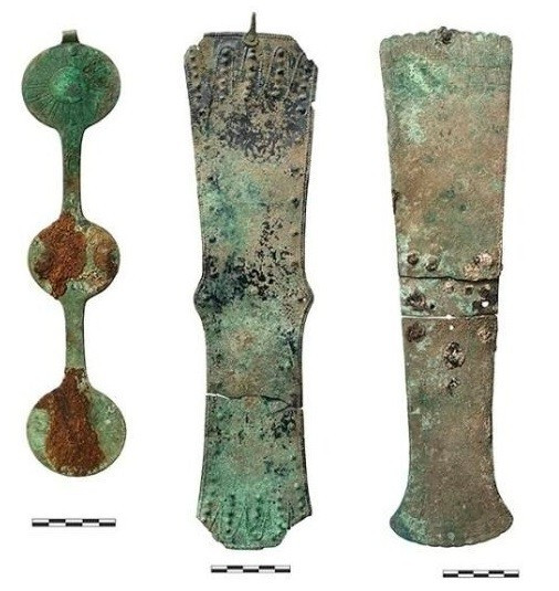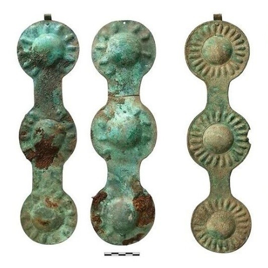 Trong số hàng trăm hiện vật được tìm thấy trong khu phức hợp tế lễ này có những dải lông bằng đồng, những mảnh sắt... thuộc về ít nhất một chục dây cương ngựa. Số dây cương này được trang trí bằng những vòng tròn kim loại phẳng, tròn. Một số tượng trưng cho chim chóc và các loài động vật thần thoại, trong khi số khác có họa tiết hình học hoặc khuôn mặt người. Ảnh: Ural Archaeological Expedition / Institute of Archaeology of the Russian Academy of Sciences.