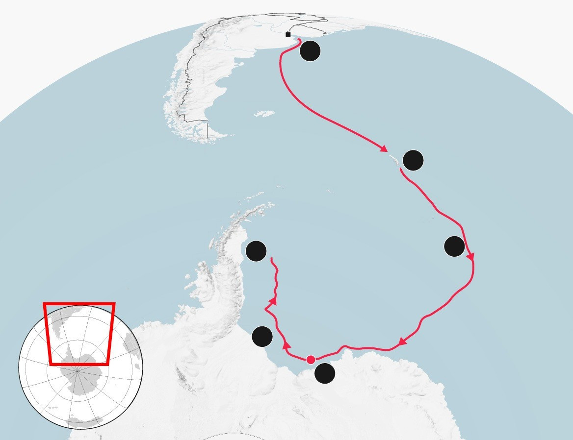 Đoàn thám hiểm gồm ông Shackleton, 26 thành viên thủy thủ đoàn lên con tàu Endurance rời đảo Nam Georgia ở phía nam Đại Tây Dương để tới Nam Cực. Ngoài ra còn có một người trốn theo tàu, 69 con chó và một con mèo. Đoàn thám hiểm khởi hành vào ngày 5/12/1914. Ảnh: PA.