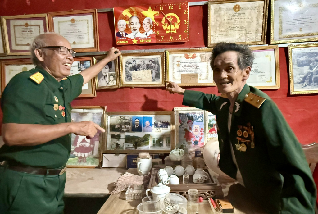 Cựu chiến binh Nguyễn Văn Bách (bên phải) và Mông Văn Ơn bên tấm ảnh chụp chung cùng đồng đội tại Củ Chi trong ngày giải phóng miền Nam.