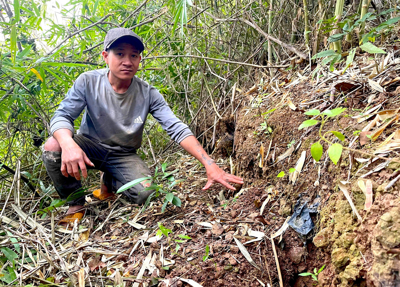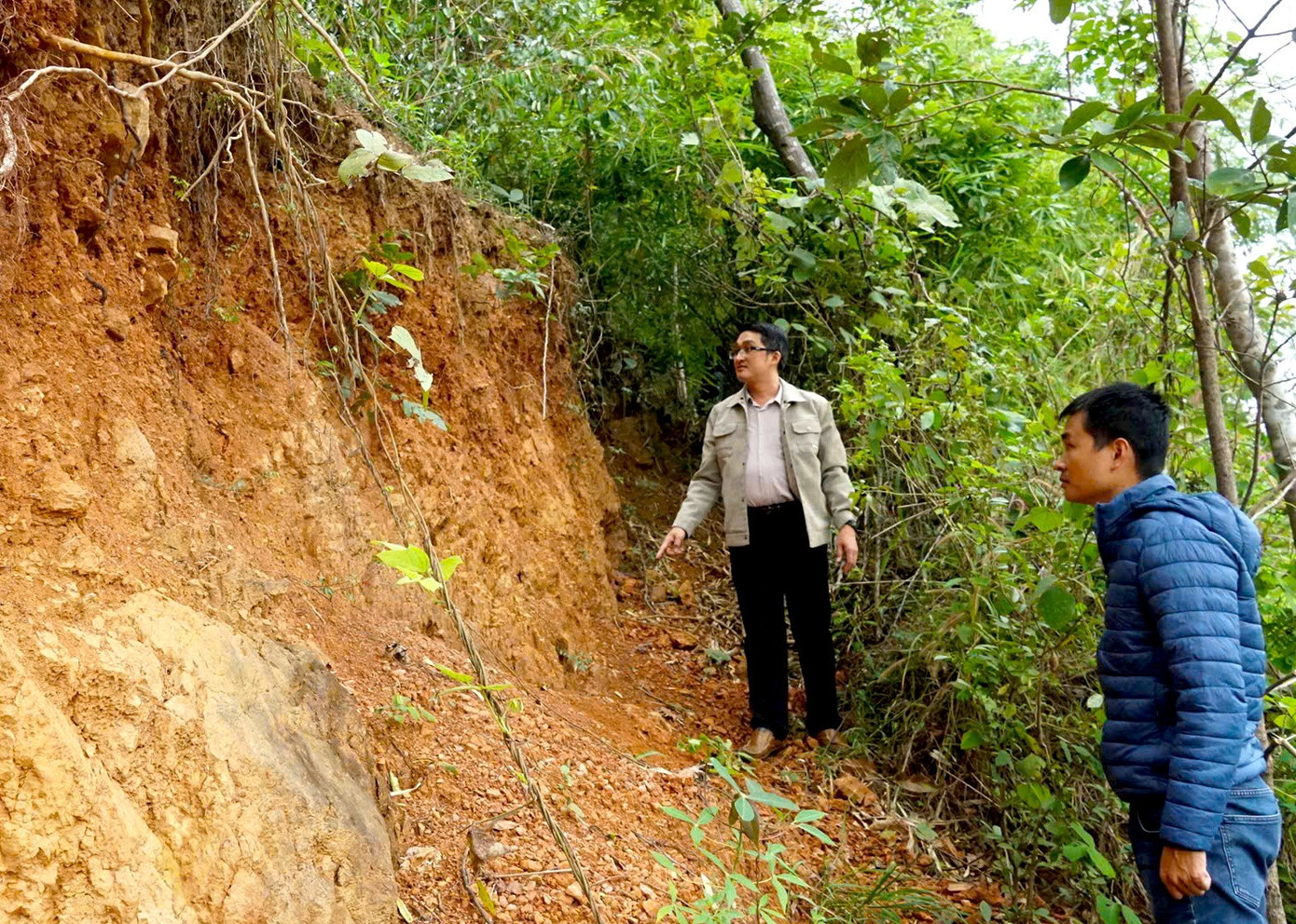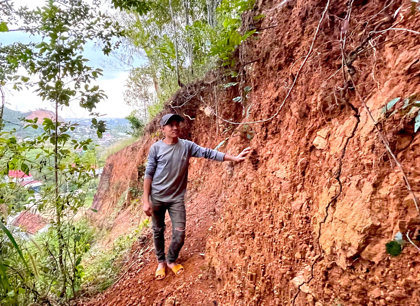Đáng nói, một phần đất ở rìa đồi bị sụt lún, tạo rãnh sâu chừng 0,5m, dấu hiệu cho thấy khối đất đang dịch chuyển và có thể trượt xuống bất cứ lúc nào. Tại các vị trí từng xảy ra sạt lở trước đó, đất bị sạt xuống tạo thành những vách đứng cao khoảng 20m. Khi mưa lớn kéo dài, nước thấm sâu làm khối đất mềm nhão, nguy cơ trượt lở càng tăng cao.
