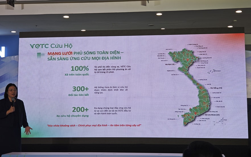 Để triển khai dịch vụ trên diện rộng, bà Vũ Thị Nguyệt, Chủ tịch Hội đồng thành viên VETC cho biết đơn vị đã đầu tư hơn 200 xe cứu hộ chuyên dụng. Hệ thống phương tiện bao gồm xe tải nhỏ, xe tải lớn, xe cẩu và thậm chí cả xe máy để linh hoạt ứng phó tùy thuộc vào từng tình huống cứu hộ cụ thể.