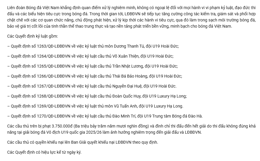 Cụ thể, các quyết định kỷ luật được ban hành gồm: Quyết định số 1263 đến 1267/QĐ-LĐBĐVN đối với các cầu thủ Dương Thanh Tú (thủ môn), Võ Xuân Thiện, Trần Nhật Lương, Thái Bá Bảo Hoàng và Nguyễn Đại Huệ của đội U19 Hoài Đức; Quyết định số 1268 và 1269/QĐ-LĐBĐVN đối với cầu thủ Đoàn Quốc Huy và thủ môn Vũ Tuấn Anh của đội U19 Luxury Hạ Long; cùng Quyết định số 1270/QĐ-LĐBĐVN đối với cầu thủ Đào Minh Trí của đội U19 Trung tâm Bóng đá Đào Hà.