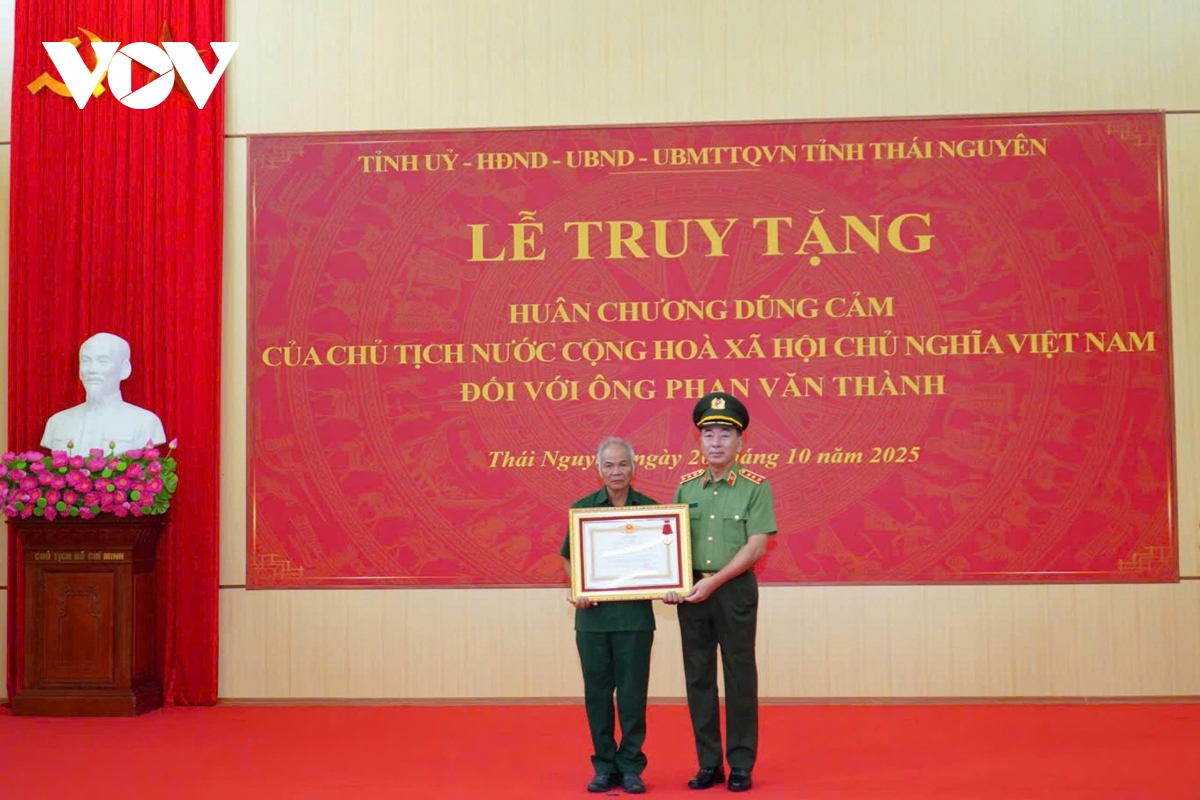 Thượng tướng Trần Quốc Tỏ, Ủy viên Trung ương Đảng, Phó Bí thư Đảng ủy Công an Trung ương, Thứ trưởng Bộ Công an và Bí thư Tỉnh ủy Thái Nguyên Trịnh Xuân Trường đã trao Huân chương cho đại diện gia đình ông Phan Văn Thành.