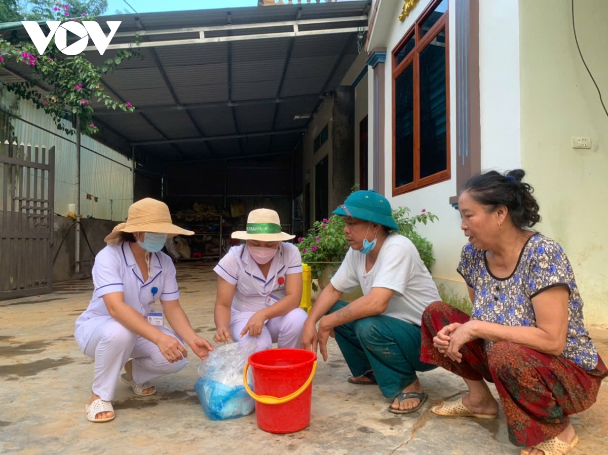 Cán bộ y tế hỗ trợ người dân khử khuẩn nguồn nước tại vùng bị ảnh hưởng mưa lũ