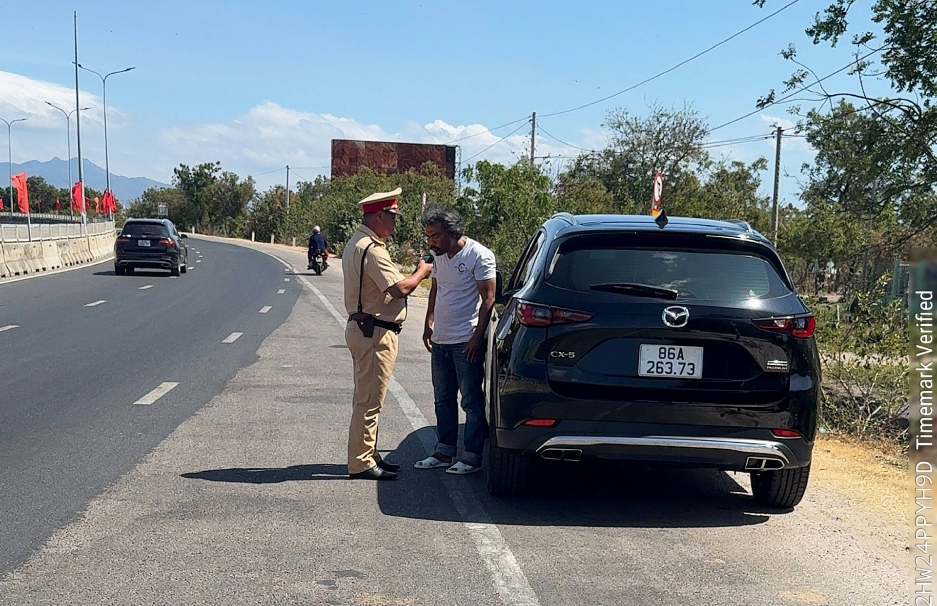 Lực lượng CSGT kiểm tra nồng độ cồn người điều khiển ô tô trên tuyến quốc lộ 1A đoạn qua địa bàn tỉnh Lâm Đồng