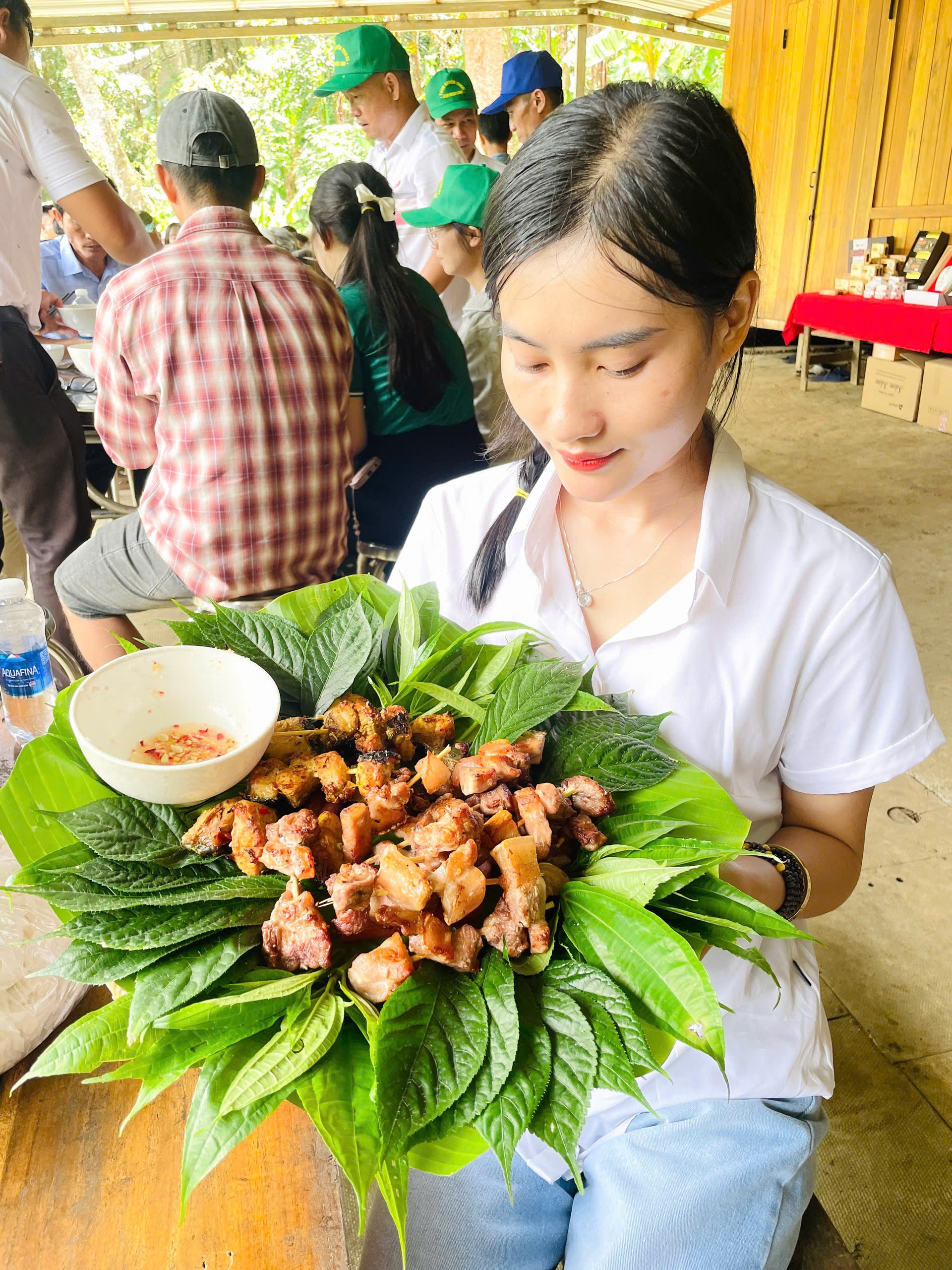 Đặc sản thịt nướng cuốn lá sâm của xã Trà Linh. Ảnh: PHAN VINH
