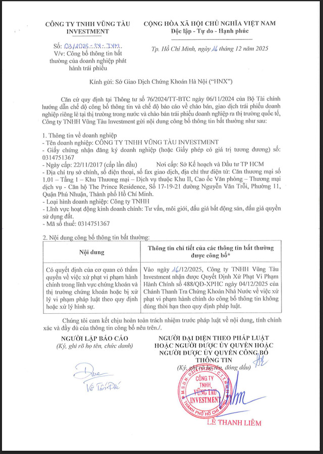 Theo đó, ngày 16/12/2025, Vũng Tàu Investment nhận được Quyếtđịnh Xử phạt vi phạm hành chính số 488/QĐ-XPHC ngày 04/12/2025 của Chánh ThanhTra Chứng khoán Nhà nước về việc xửphạt vi phạm hành chính do công bố thông tinkhông đúng thời hạn theo quy định pháp luật.