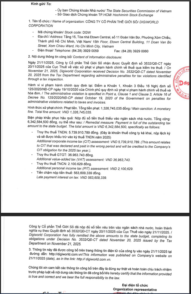 Digiworld cho biết đã nộp đủ số tiền nêu trên vào ngân sáchnhà nước, hoàn thành nghĩa vụ theo quyết định của Cục Thuế vào ngày 21/11/2025.