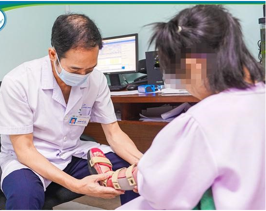Khi đến khám tại Bệnh viện Nhi Trung ương, bé N.L có biểu hiện cong cẳng chân phải. Các bác sĩ khoa Chỉnh hình và khoa Phục hồi chức năng đã thăm khám, tư vấn và điều trị bảo tồn bằng nẹp chỉnh hình nhằm hạn chế biến dạng xương.