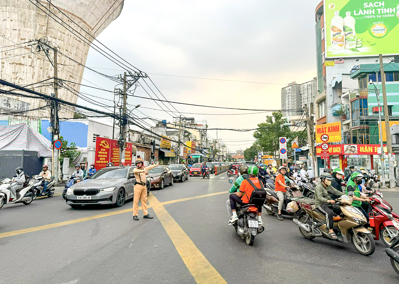 Cảnh sát giao thông, Công an TPHCM phân luồng giao thông tại tuyến đường Nguyễn Tất Thành - Hoàng Diệu nhằm chống ùn tắc