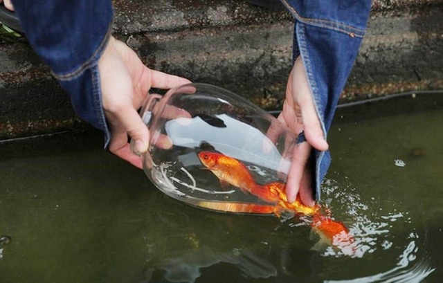 Thả cá chép để tiễn đưa ông Táo về trời, cầu mong năm mới bình an, thuận lợi. (Ảnh: Thành Đạt/TTXVN).