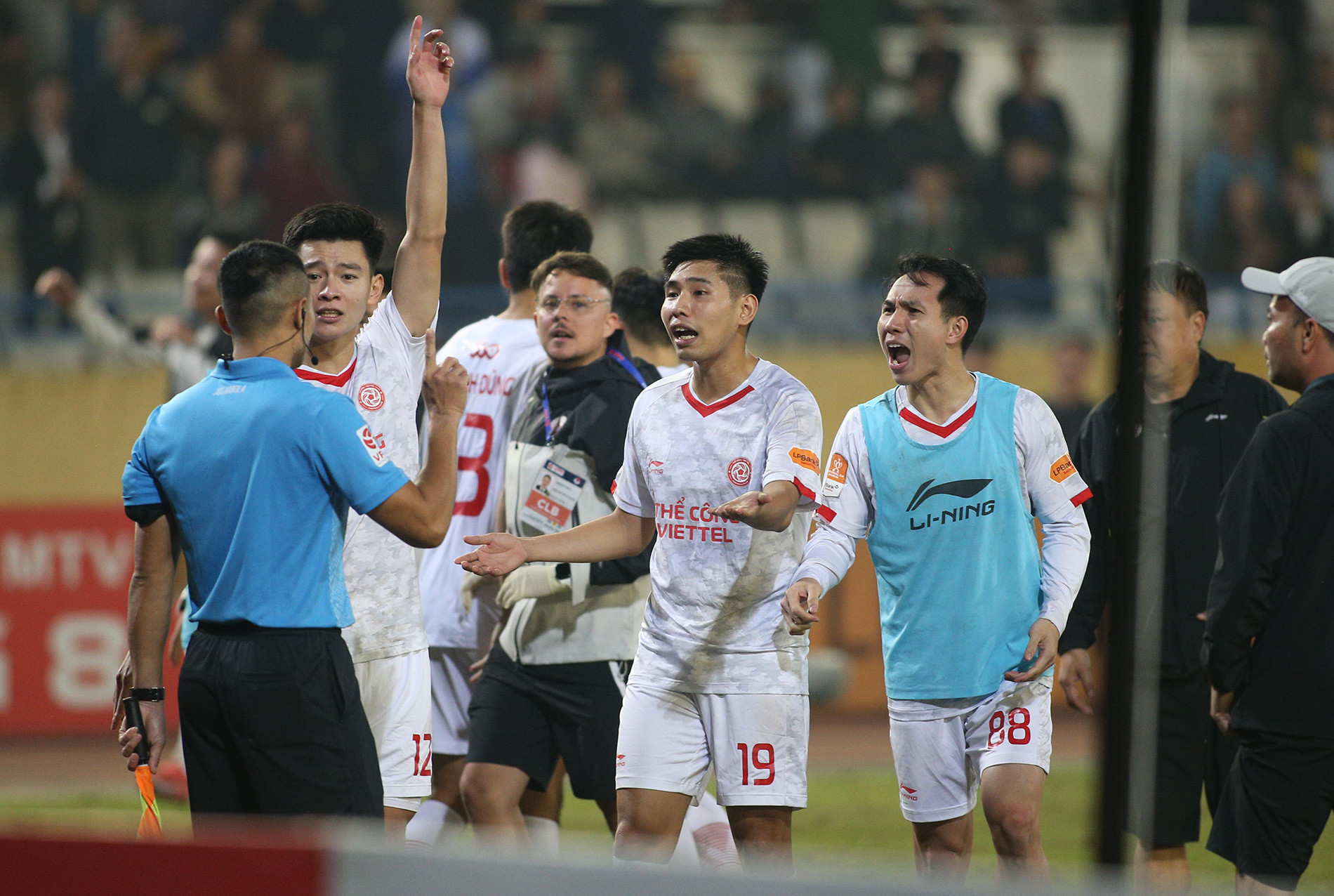 Các cầu thủ Thể Công Viettel "chất vấn" trọng tài biên khi VAR không công nhận bàn thắng của Wesley Nata.
