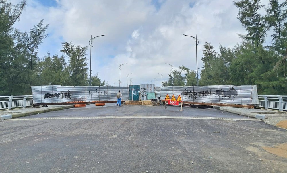 Phía 2 đầu cầu vượt cửa biển Thuận An đang được rào chắn lại, không cho phương tiện lưu thông vì chưa thông xe. Ảnh: S.THÙY