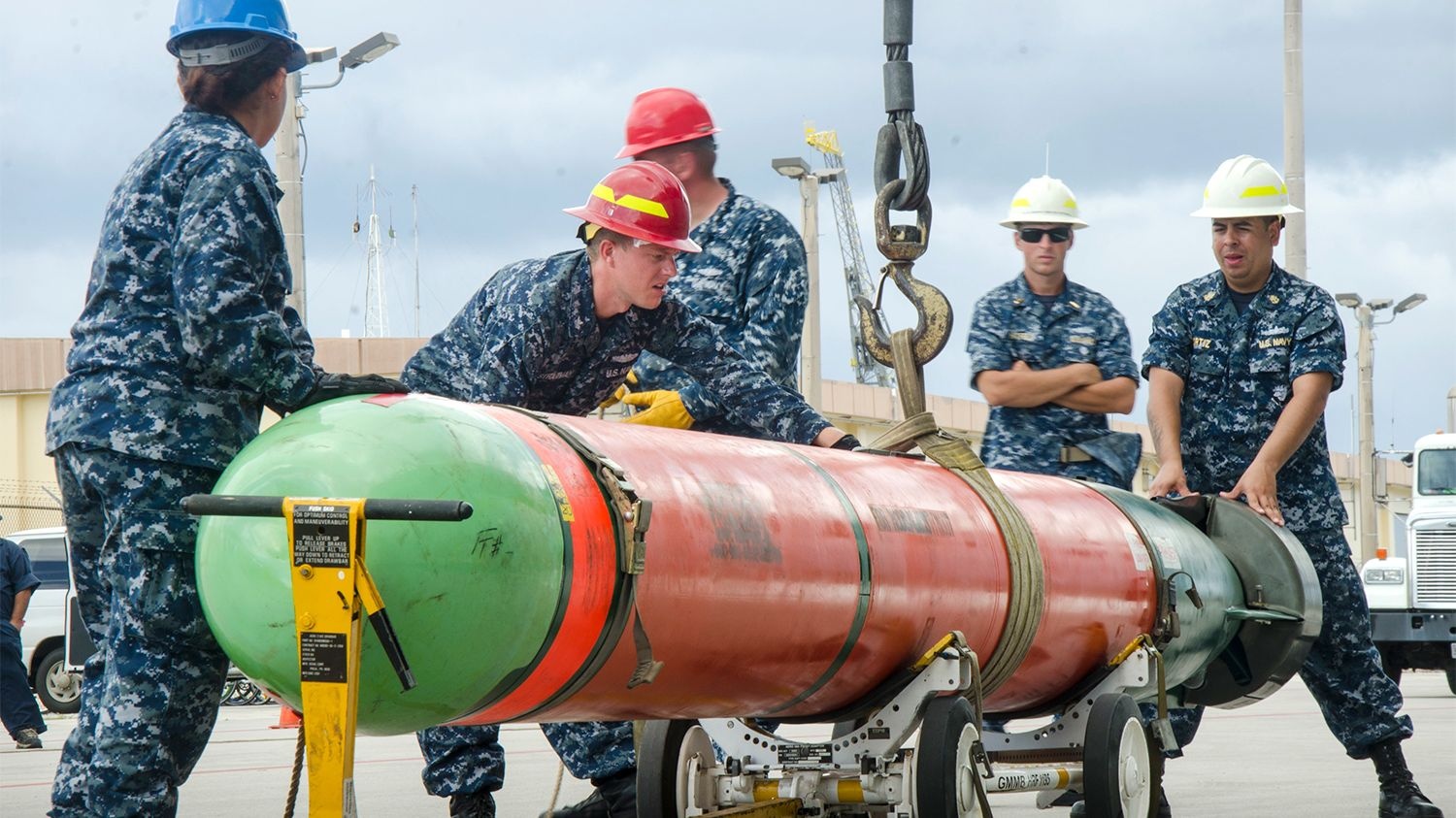 Các thủy thủ trên tàu ngầm USS Frank Cable đang giữ ổn định một quả ngư lôi hạng nặng Mark 48 trong quá trình nạp vũ khí tại Guam vào năm 2017. Ảnh: Hải quân Mỹ.