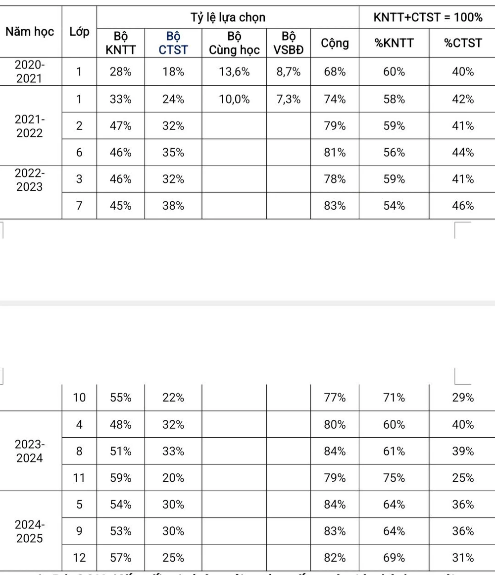 Tỷ lệ lựa chọn các bộ sách giáo khoa của Nhà xuất bản Giáo dục Việt Nam các năm vừa qua