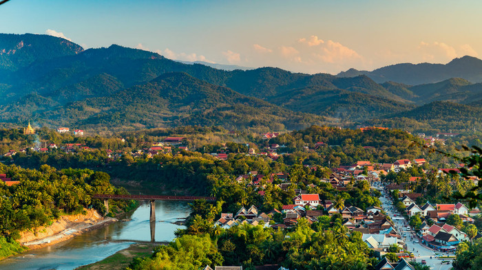 Cảnh sông, núi và cầu ở Luang Prabang — hình ảnh điển hình cho hành trình dọc sông Mekong.