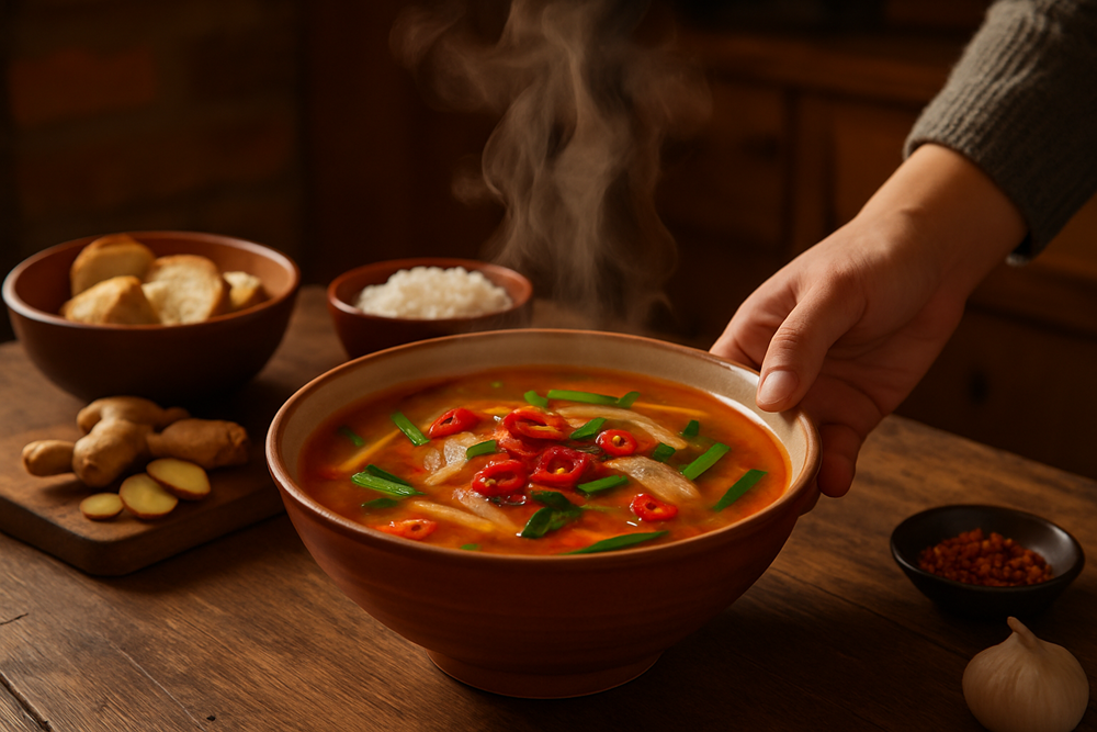 Nhiều gia vị cay nóng vốn có đặc tính kháng viêm và kháng khuẩn tự nhiên. Gừng chứa gingerol, tỏi giàu allicin, trong khi ớt cung cấp lượng lớn vitamin C và chất chống oxy hóa. Khi kết hợp trong các món ăn nóng, chúng góp phần hỗ trợ cơ thể chống lại cảm lạnh thông thường và bệnh viêm họng dễ gặp trong mùa đông.