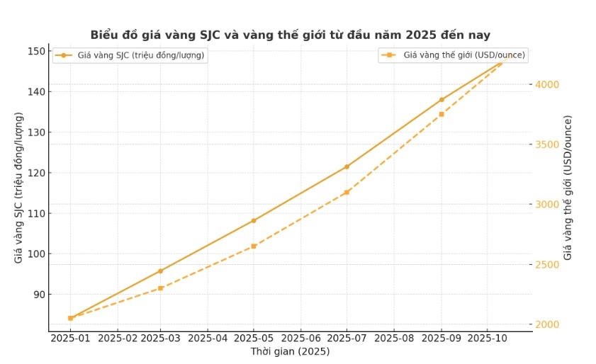 Biểu đồ so sánh giá vàng SJC (triệu đồng/lượng) và giá vàng thế giới (USD/ounce) từ đầu năm 2025 đến nay. Đường liền màu vàng thể hiện vàng SJC: tăng gần gấp đôi từ khoảng 84 triệu lên gần 149 triệu đồng/lượng. Đường màu vàng gạch đứt là vàng thế giới: tăng mạnh từ hơn 2.000 USD/ounce lên hơn 4.200 USD/ounce.