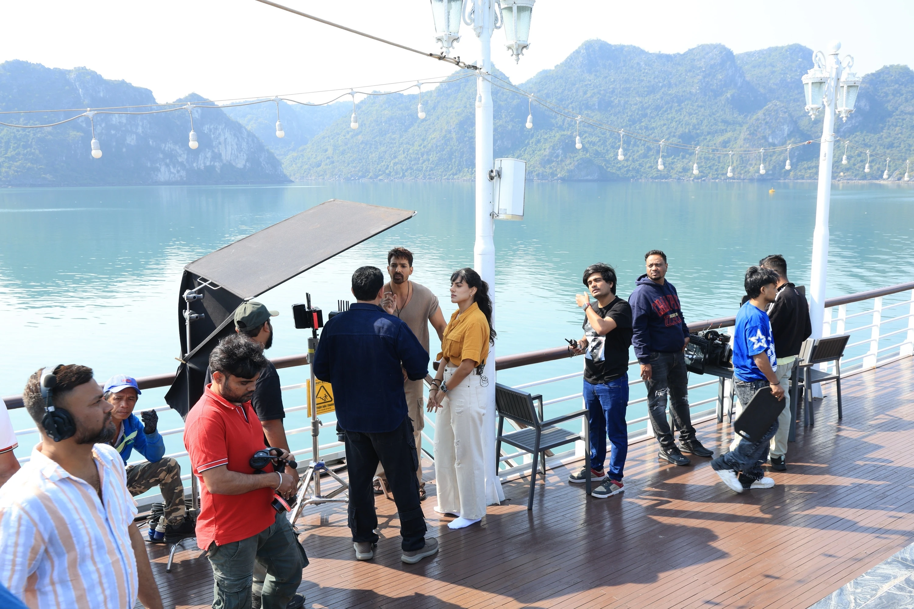 Đoàn làm phim Silaa thực hiện cảnh quay trên du thuyền giữa vịnh Hạ Long, tháng 1. Ảnh: Đơn vị cung cấp.