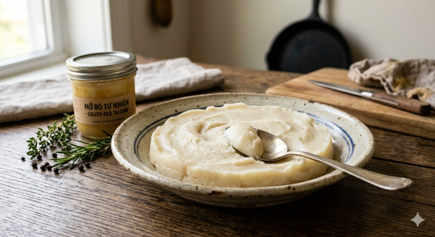 Mỡ bò là dạng chất béo dùng trong nấu ăn truyền thống, sản xuất từ lớp mỡ cứng quanh nội tạng bò. Dù có giá trị trong chiên và nướng, mỡ bò chứa nhiều chất béo bão hòa, làm tăng cholesterol và ảnh hưởng tim mạch.
