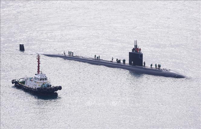 Tàu ngầm hạt nhân Greeneville (phải) của Mỹ neo tại căn cứ hải quân cảng Busan, Hàn Quốc ngày 23/12/2025. Ảnh: YONHAP/TTXVN